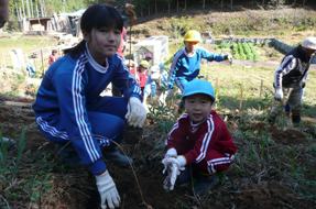11月12日・14日 坂口の森づくり 日野川の水はどこで生まれるのでしょうか。森で生まれます。越前市坂口地区は日野川の源流の森の一つです。ここで生まれた水が川となって日野川に流れます。水源の森が豊かでないと、水不足になったり、沢の水の温度が上がって冷たい水を好む生き物がすめなくなったりします。将来、豊かな森になる事を目指して坂口地区の山に木を植えました。この子供たちがお年寄りになる頃には豊かな森となる事でしょう。 |
