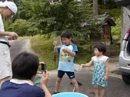 8月8日 ドジョウすくいをしよう 今では、すっかり姿を見なくなったドジョウですが、越前市の坂口地区の川では、今でもドジョウが生きています。川の水が美しいことがうかがえます。学術調査として許可を得ていますので、捕まえて、観察してから川にかえしました。野生のドジョウを見るのは初めての人ばかりでした。 |