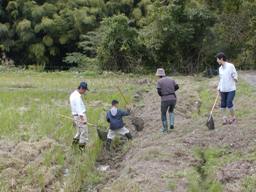 10月3日 大きなタニシを探そう 越前市坂口地区の田んぼは生き物が豊です。ドジョウもいれば、大きなタニシもいます。知らない人はジャンボタニシと間違えるほどの大きさ。れっきとした日本古来のマルタニシです。この時期は稲刈りも終わり、田んぼの水溜りですごしています。そのタニシを捕まえて、観察しました。こんな大きなタニシがいる田んぼで育つ坂口のお米は、たしかに美味しいです。 |