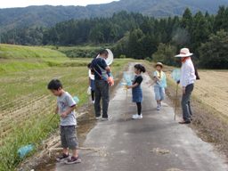10月3日 大きなタニシを探そう 越前市坂口地区の田んぼは生き物が豊です。ドジョウもいれば、大きなタニシもいます。知らない人はジャンボタニシと間違えるほどの大きさ。れっきとした日本古来のマルタニシです。この時期は稲刈りも終わり、田んぼの水溜りですごしています。そのタニシを捕まえて、観察しました。こんな大きなタニシがいる田んぼで育つ坂口のお米は、たしかに美味しいです。 |