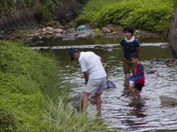 8月8日 ドジョウすくいをしよう 今では、すっかり姿を見なくなったドジョウですが、越前市の坂口地区の川では、今でもドジョウが生きています。川の水が美しいことがうかがえます。学術調査として許可を得ていますので、捕まえて、観察してから川にかえしました。野生のドジョウを見るのは初めての人ばかりでした。 |