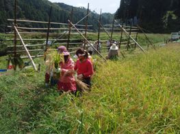 9月17日 稲刈り 坂口地区うららの町づくり振興会環境部会と坂口小学校と共に、稲刈りを行いました。この田んぼは毎年、振興会と坂口小学校とエコビレッジ交流センターで、無農薬、化学肥料を使わず、有機農法による米づくりを行っている田んぼです。しかしもコウノトリが生息できる田んぼにするためのモデル、学習の場として、エサになるような多くの生き物が生息する田んぼ作りを行っています。昔ながらの「はざ」も作って稲を干しました。コンバインで刈る現代では、これも珍しい風景です。 |