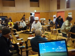 イノシシが増えたのはなぜ 「アースディえちぜん2010」において「イノシシが増えたのはなぜ?」の企画を実施する前に、越前市エコビレッジ交流センターを会場に事前勉強を行いました。イノシシの現状を市役所農林整備課からお聞きし、イノシシ料理も食べました。 |