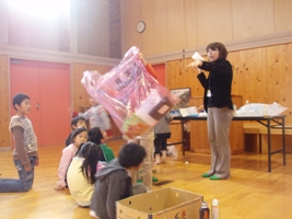 12月5日 気軽に環境学習 雑がみ救出作戦 環境問題って難しい。そう考えずに、気軽に身近なことから取り組みませんか。人形劇を見て、「雑かみ救出作戦」と題して、つい捨ててしまうそんな雑紙を救う方法を学びました。紙は、他のゴミと混ぜて捨ててしまえばゴミ。でもキチント仕分けして紙だけにすれば紙資源として生まれかわります。正しいゴミ出しの方法と仕分け方を学びました。 |