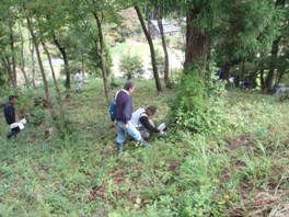 11月12日・14日 坂口の森づくり 日野川の水はどこで生まれるのでしょうか。森で生まれます。越前市坂口地区は日野川の源流の森の一つです。ここで生まれた水が川となって日野川に流れます。水源の森が豊かでないと、水不足になったり、沢の水の温度が上がって冷たい水を好む生き物がすめなくなったりします。将来、豊かな森になる事を目指して坂口地区の山に木を植えました。この子供たちがお年寄りになる頃には豊かな森となる事でしょう。 |