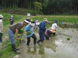 田植体験 越前市坂口地区の地元農家の方々、坂口地区うららの町づくり振興会環境部会の皆さんの指導で、田植体験を行いました。学ぶ参加者の皆さんは、将来は環境関連の仕事につきいたと考えている方が多く、農業は環境を考える上での基本。米づくりの現場を体験してもらいました。この田んぼは「コウノトリが舞い降りる里づくり」と題したプロジェクトで無農薬・化学肥料を使わない米作りを長年行っており、坂口小学校の授業のフィールドとしても使われています。 |
